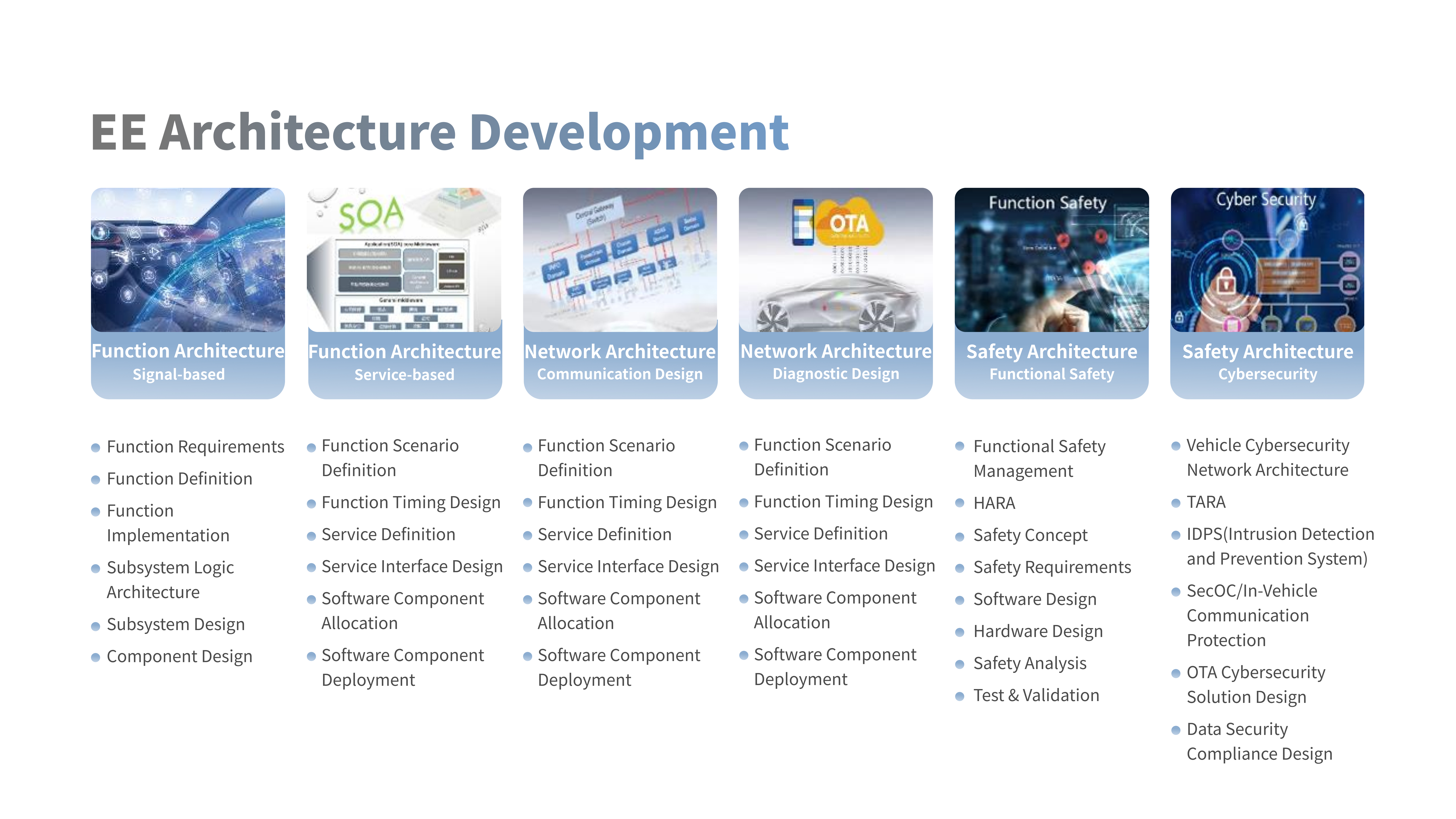 With excellent design capability for signal-and-service-oriented function architecture, communication-and-diagnosis-oriented network architecture and function-and-information-oriented safety architecture, we provide high-quality and high-standard architecture development services to domestic and international customers.