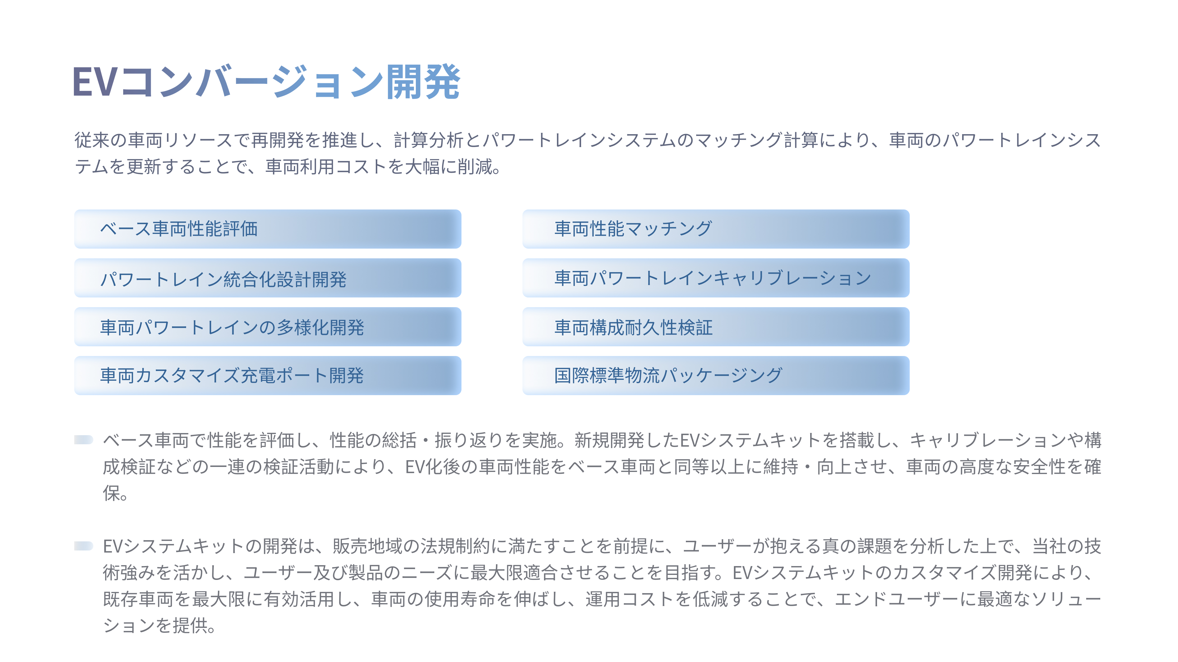 従來の車両リソースで再開発を推進し、計算分析とパワートレインシステムのマッチング計算により、車両のパワートレインシステムを更新することで、車両利用コストを大幅に削減。