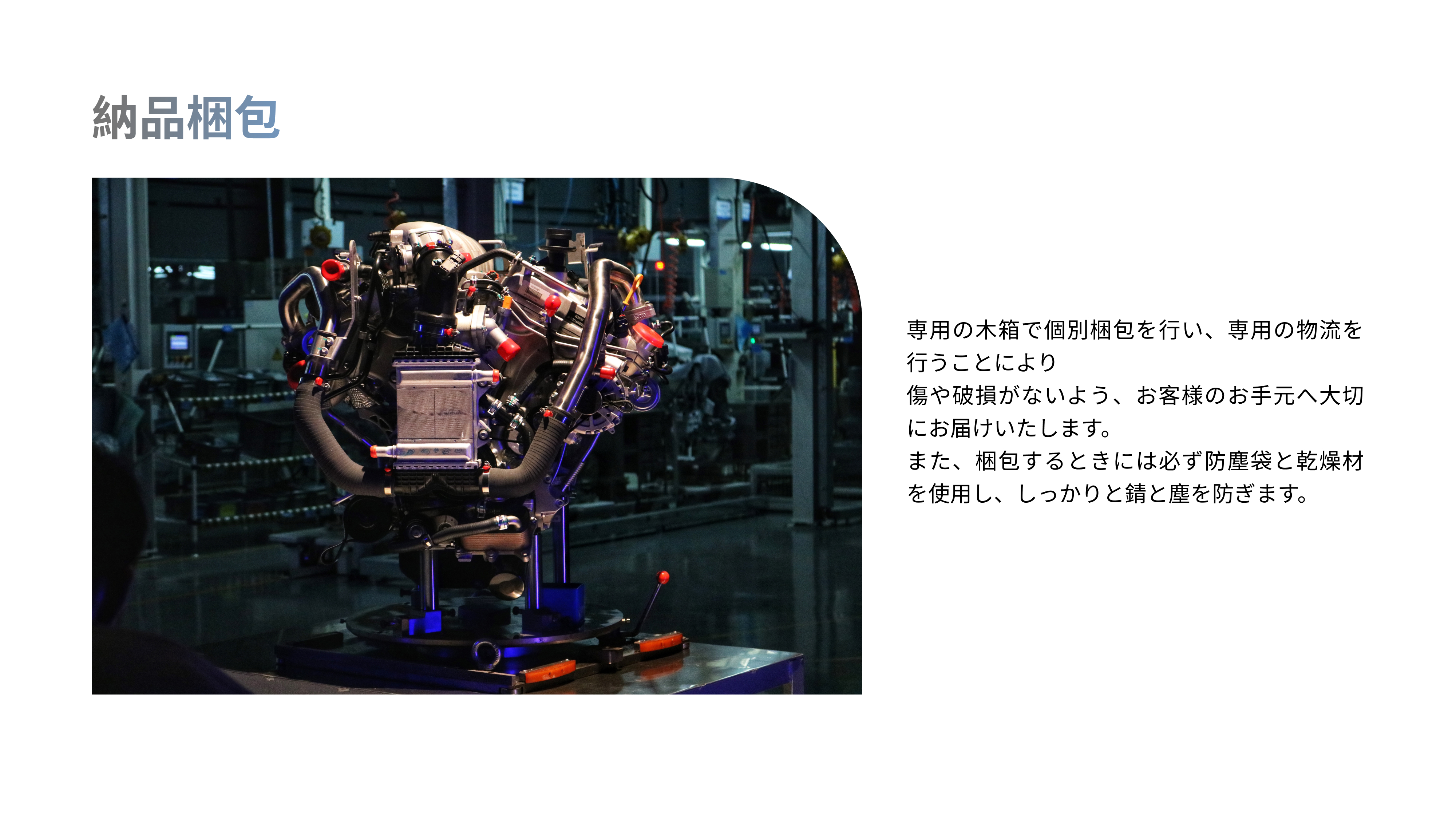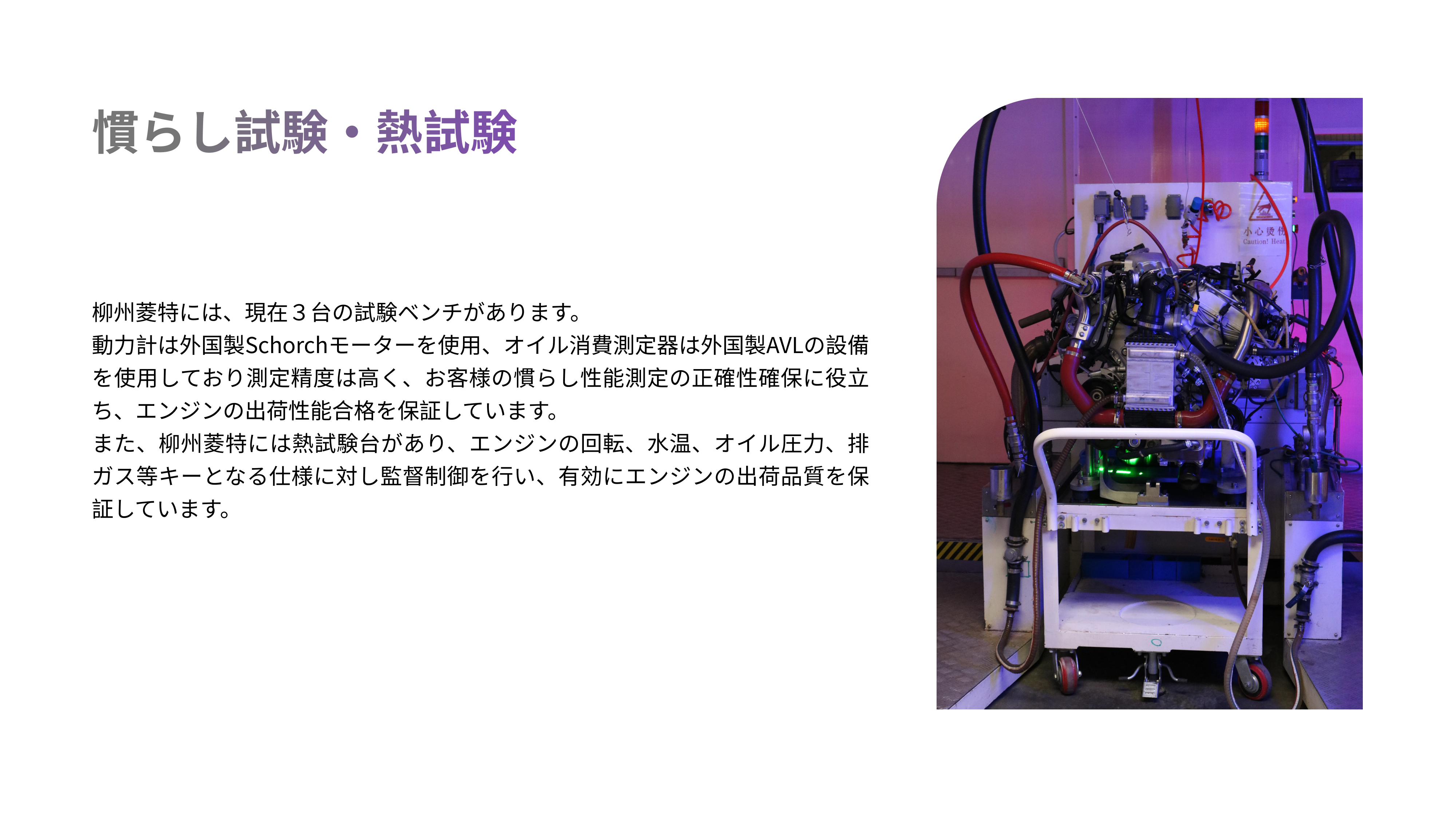 エンジンの組立→すり合わせホットテスト→入庫(kù)梱包