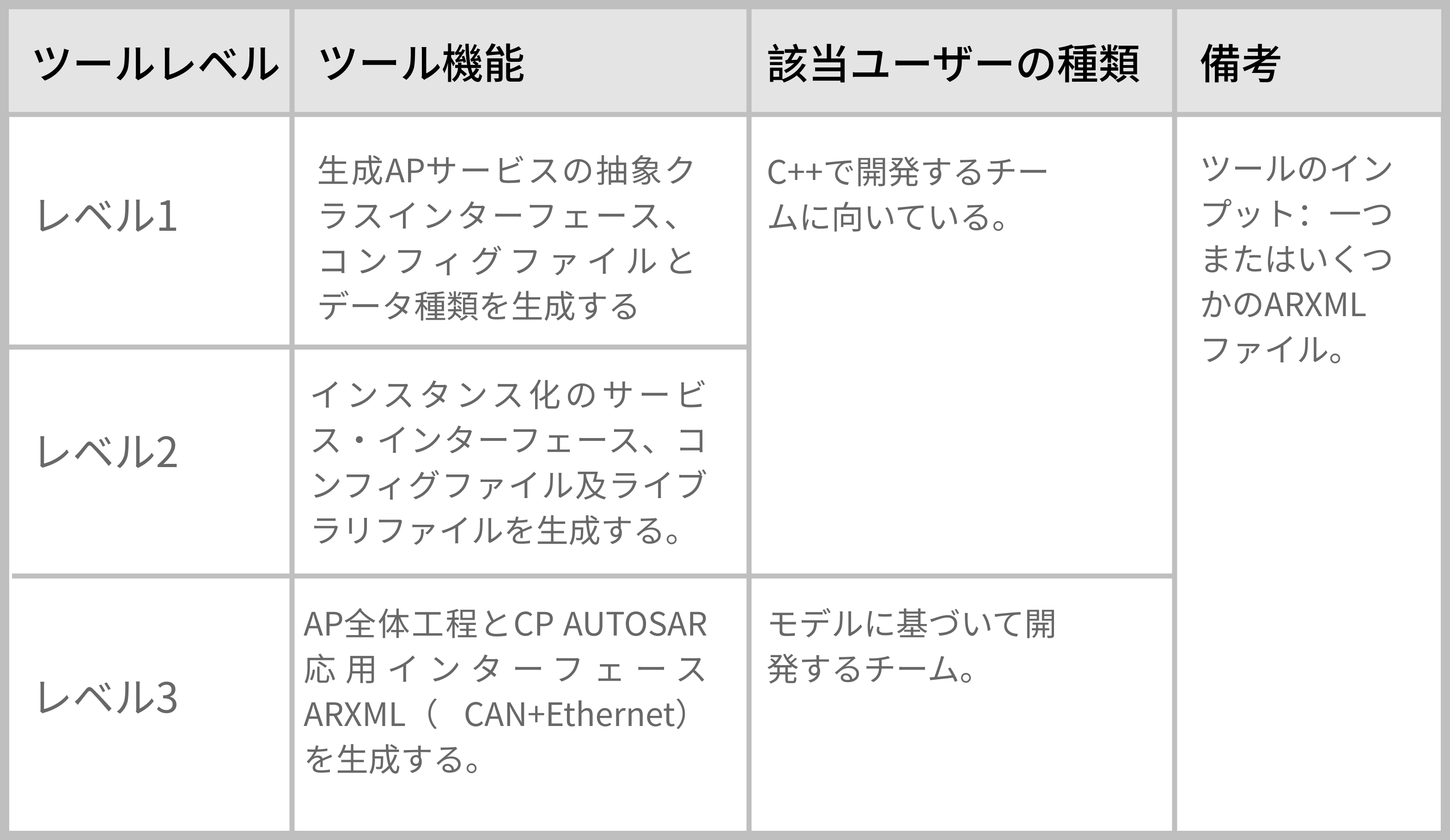 ·ソフトウェ?フレームワーク?ツール:AP AUTOSARに基づくコード自動生成ツール。