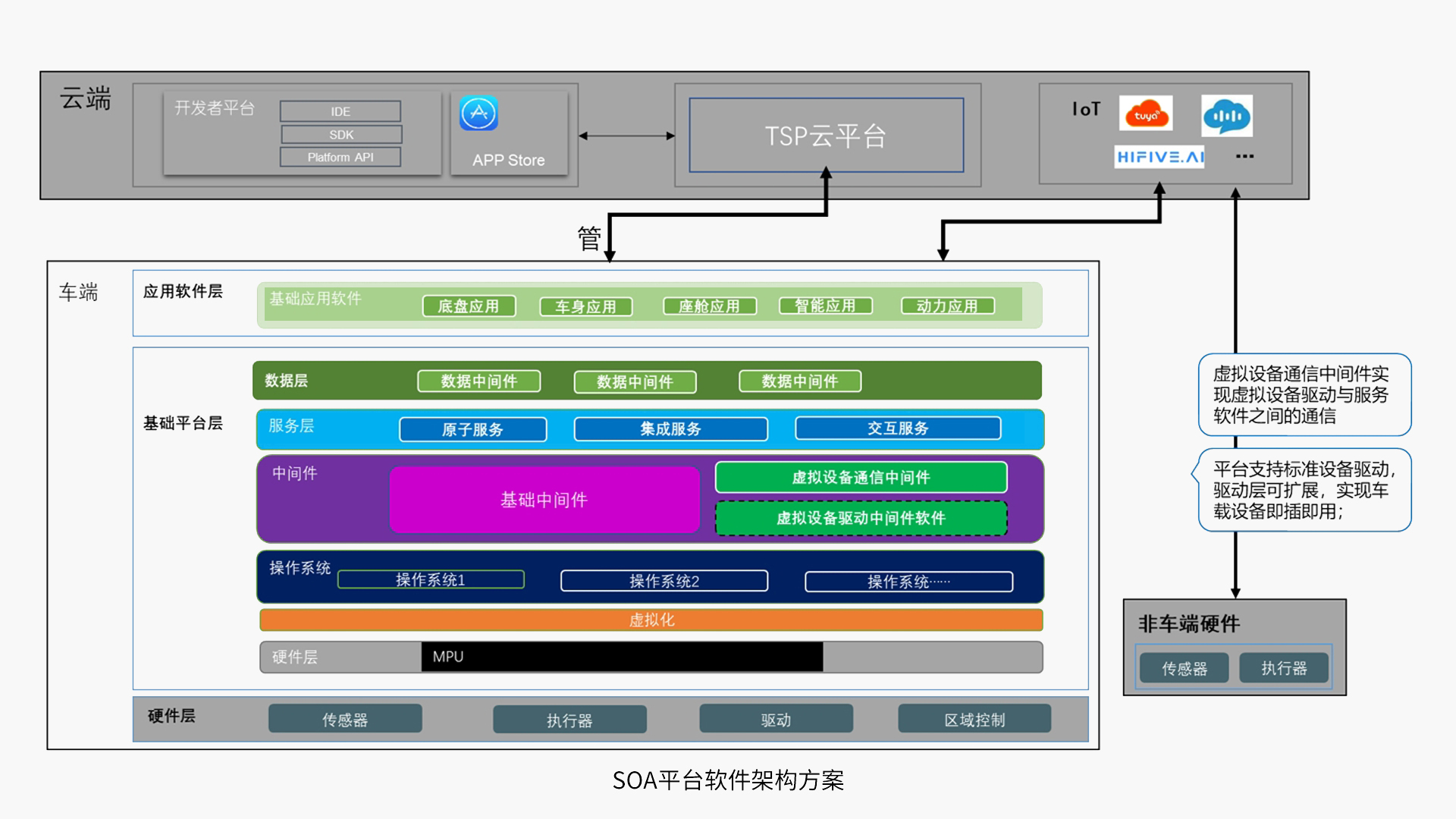 技術(shù)革新の面において、プラットフォームは多くのブレークスルーを達(dá)成しております。SOAアーキテクチャ設(shè)計では、シナリオ機(jī)能及びソフトウェアの簡素化を?qū)g現(xiàn)し、車両―クラウド連攜とIoTクラウドプラットフォームのサービス化を深く融合させました。ソフトウェア?アーキテクチャ設(shè)計では、迅速な開発と更新を可能にした階層化デカップリング?アーキテクチャ、並びにデータインターフェースを簡素化したデータベースミドルウェア及びプラグアンドプレイが対応できる仮想デバイスベースのミドルウェアを打ち出しました。