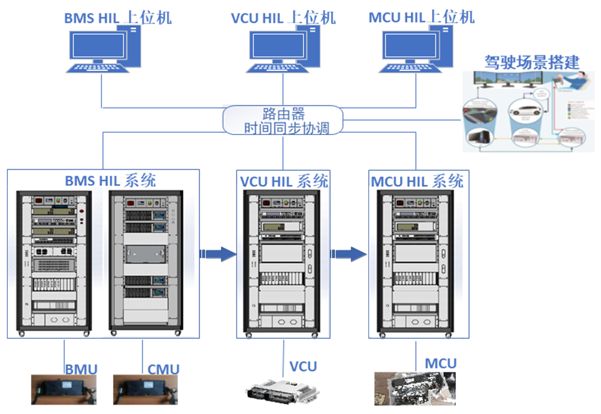 新能源三電 HIL測試系統(tǒng)的主要測試對象包括VCU、MCU、BMS三個控制器,其中,由于電機模型需要極高的運算頻率和動態(tài)響應性,因此,本項目采用基于FPGA的電機專用仿真測試方案。該系統(tǒng)能夠仿真整車工況,實現(xiàn)被測控制器的功能測試;具有故障注入功能,實現(xiàn)對被測控制器的故障診斷測試;具備CAN/LIN通訊仿真功能,能夠實現(xiàn)被測控制器的CAN/LIN通訊測試;此外基于圖形化操作軟件,實現(xiàn)手動測試和自動測試;系統(tǒng)基于模塊化設計,具有良好的擴展性,可自定義模塊;HIL系統(tǒng)聯(lián)合運行測試時,還可保證系統(tǒng)間的同步性和實時性,此系統(tǒng)還支持功能安全測試。