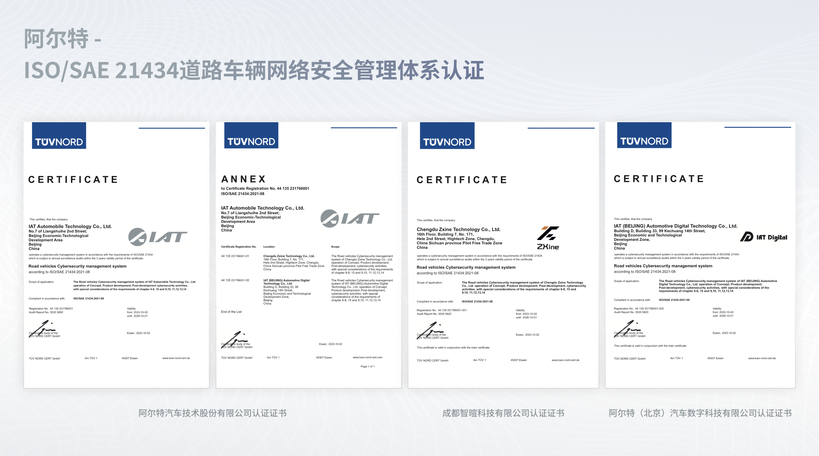 近日,阿爾特汽車技術(shù)股份有限公司正式通過了德國TüV NORD的《ISO/SAE 21434道路車輛-網(wǎng)絡(luò)安全工程》 汽車網(wǎng)絡(luò)安全管理體系認(rèn)證。這是IAT繼通過ISO 26262 管理體系認(rèn)證后,再次獲得國際標(biāo)準(zhǔn)的檢驗(yàn)與認(rèn)可,標(biāo)志著阿爾特在汽車軟件設(shè)計(jì)開發(fā)、產(chǎn)品研發(fā)及量產(chǎn)、信息安全保護(hù)、風(fēng)險(xiǎn)評估與管控等多方面的領(lǐng)先優(yōu)勢進(jìn)一步擴(kuò)大。